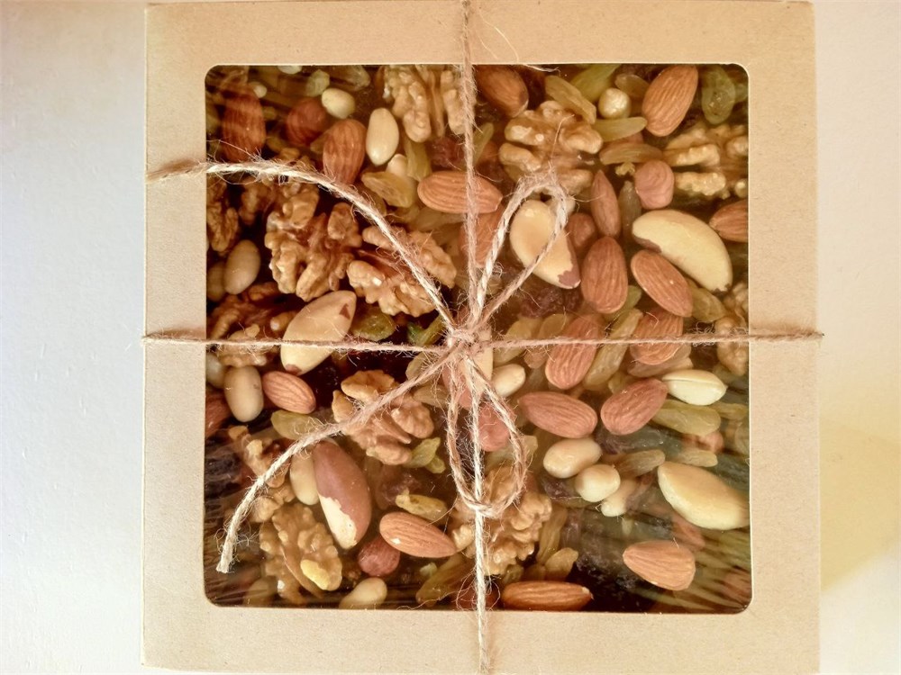 Отличный подарок по любому поводу, орехи и изюм упакованы в красивую коробочку с окошкам.